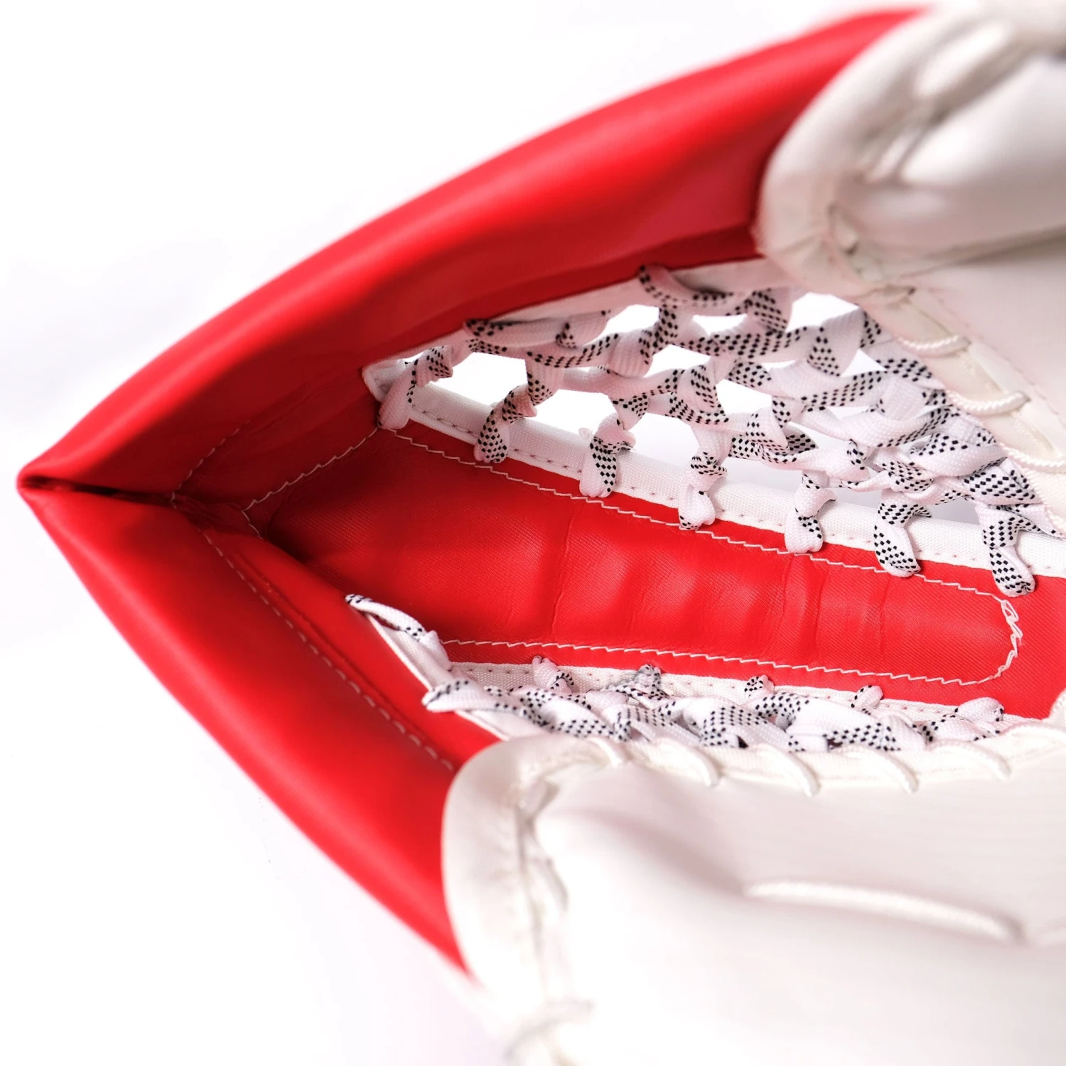 The pocket uses a double straight T design for better visibility and depth on the catch. This kind of style is nice for the butterfly goalie, who often has to make decisions at odd angles; the easier it is to track and funnel the puck into the catcher, the easier it will be to make those clutch saves across the crease.Â