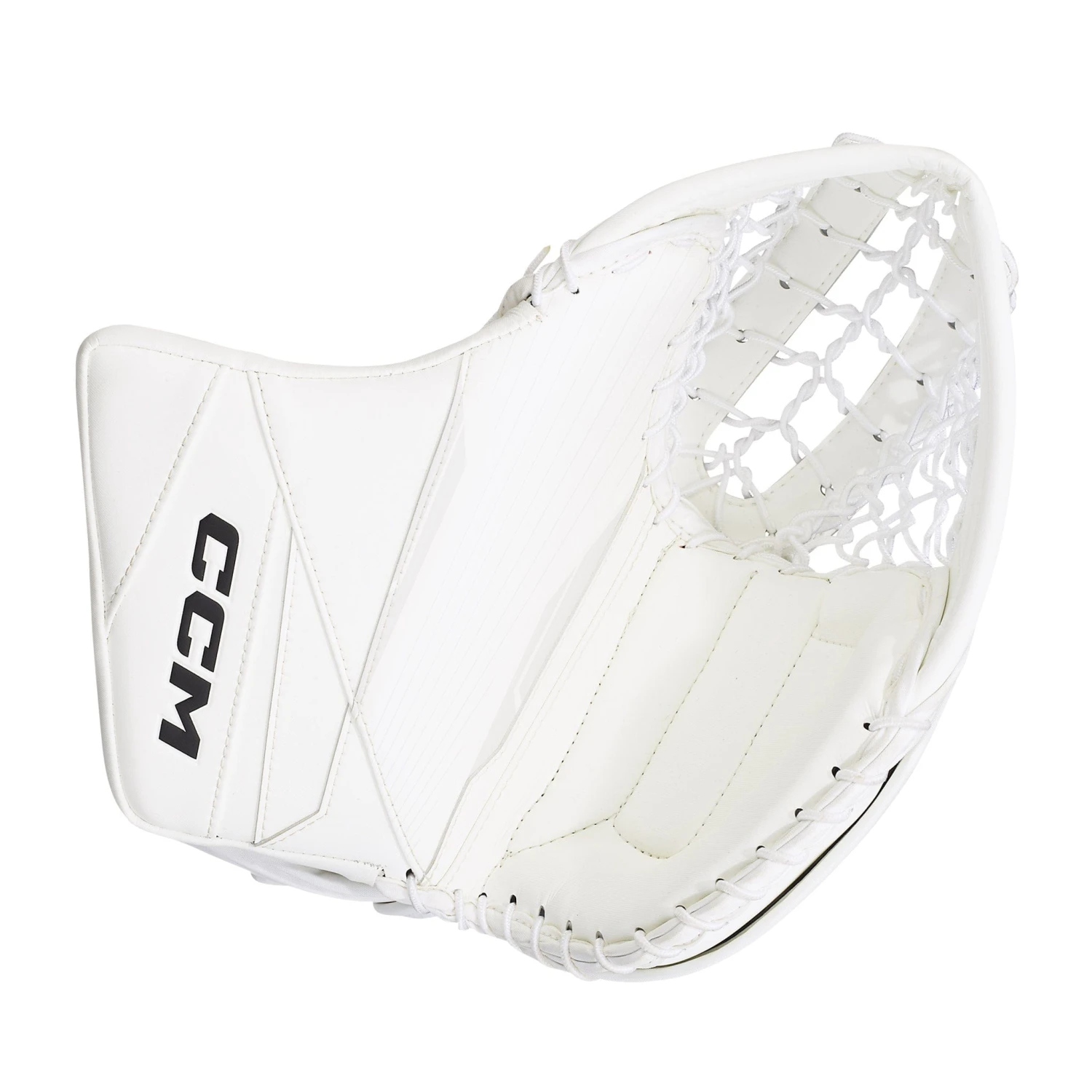 The CCM Axis 2 Senior Goalie Catcher comes in sizes 33+1, 34+1, 34+2, and 35+2, and the following colourways: White and White/Navy/Red/Gold.