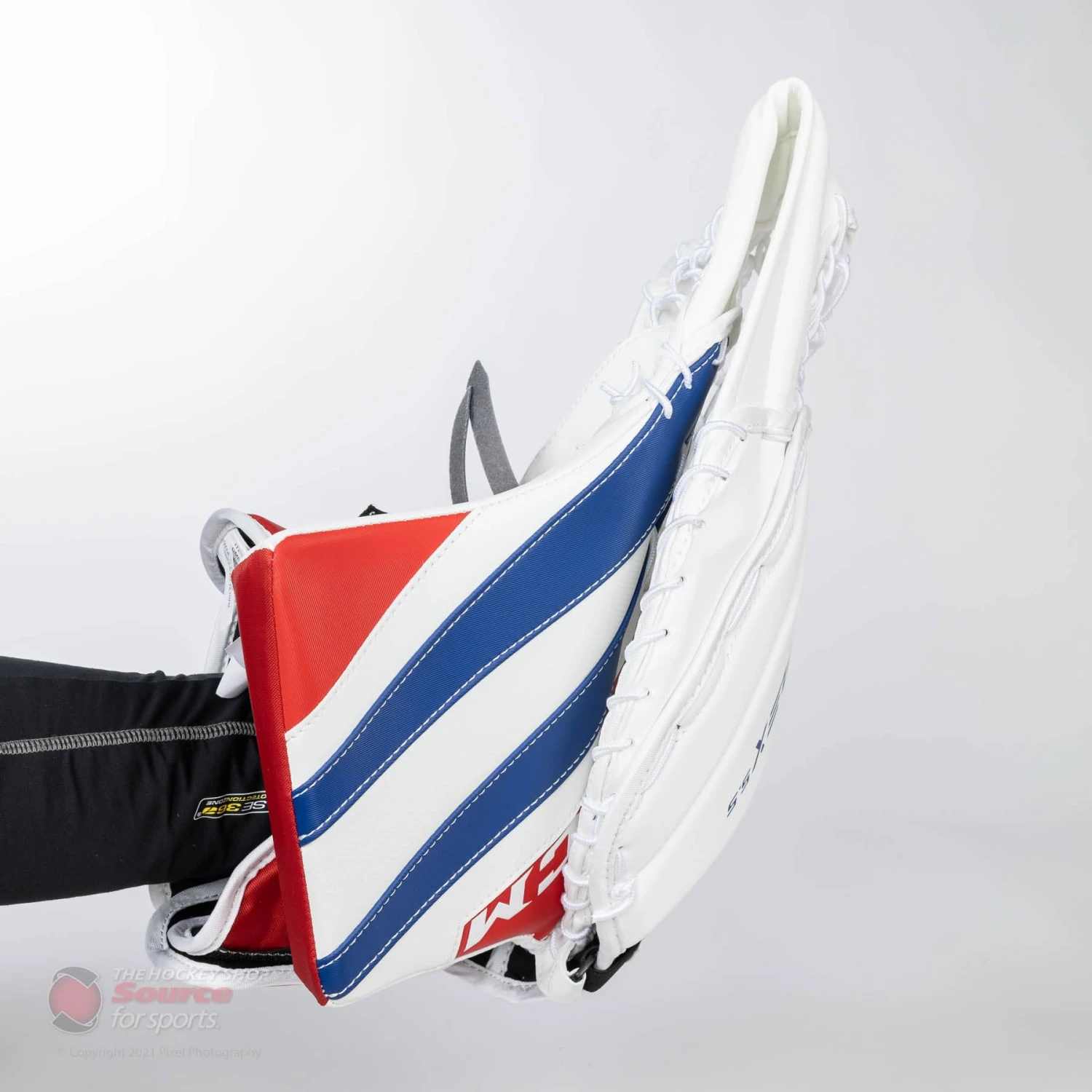 The CCM Extreme Flex E5.5 Senior Goalie Catcher is a stock only color offering, available in the following colorways; Boston, Chicago, Detroit, Montreal, Toronto, All White, White / Black, and White / Navy. The E5.5 Catcher is available in Regular and Full Right hands.
