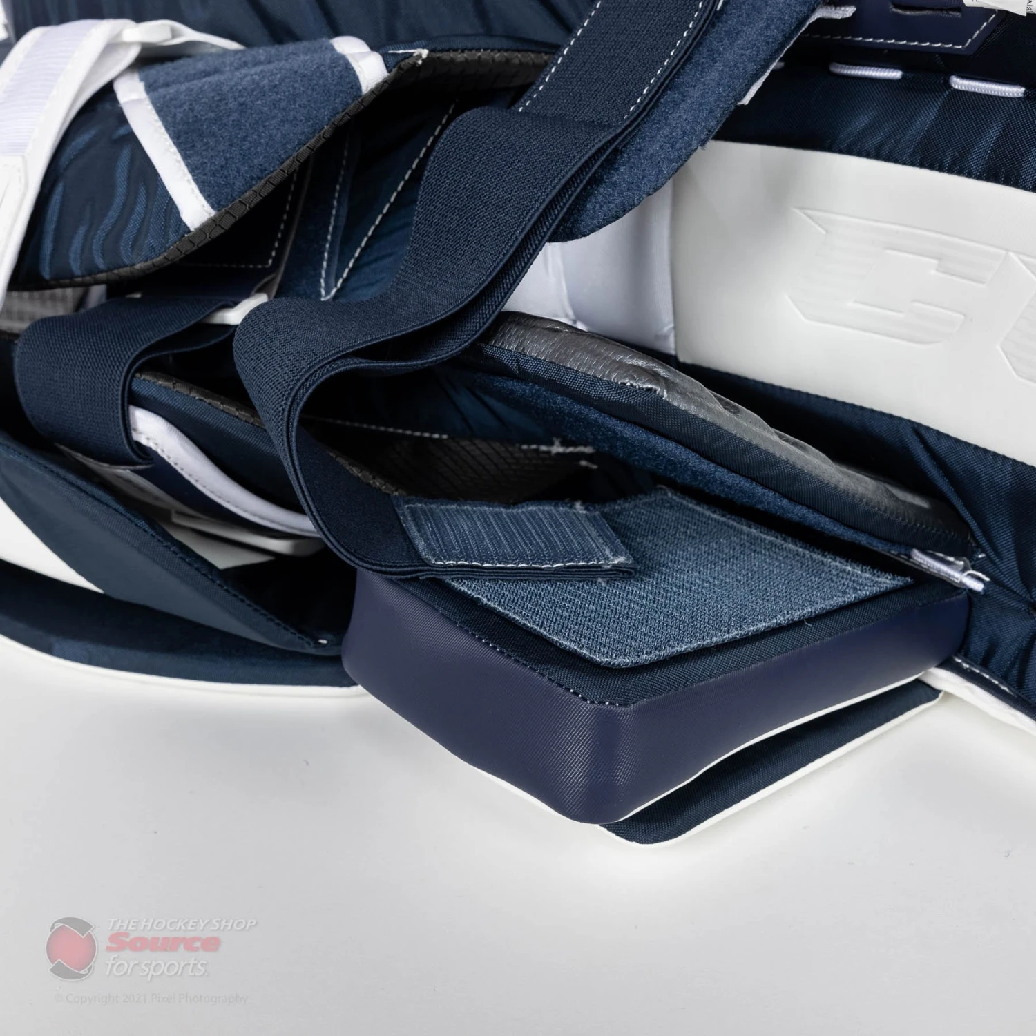 The CCM Extreme Flex E5.9 INT Goalie Leg Pads are a stock only color offering, available in the following colorways; Boston, Chicago, Detroit, Montreal, Toronto, All White, White / Black, and White / Navy. The E5.9 INT Leg pads are available in sizes 30+1 through 32+1.