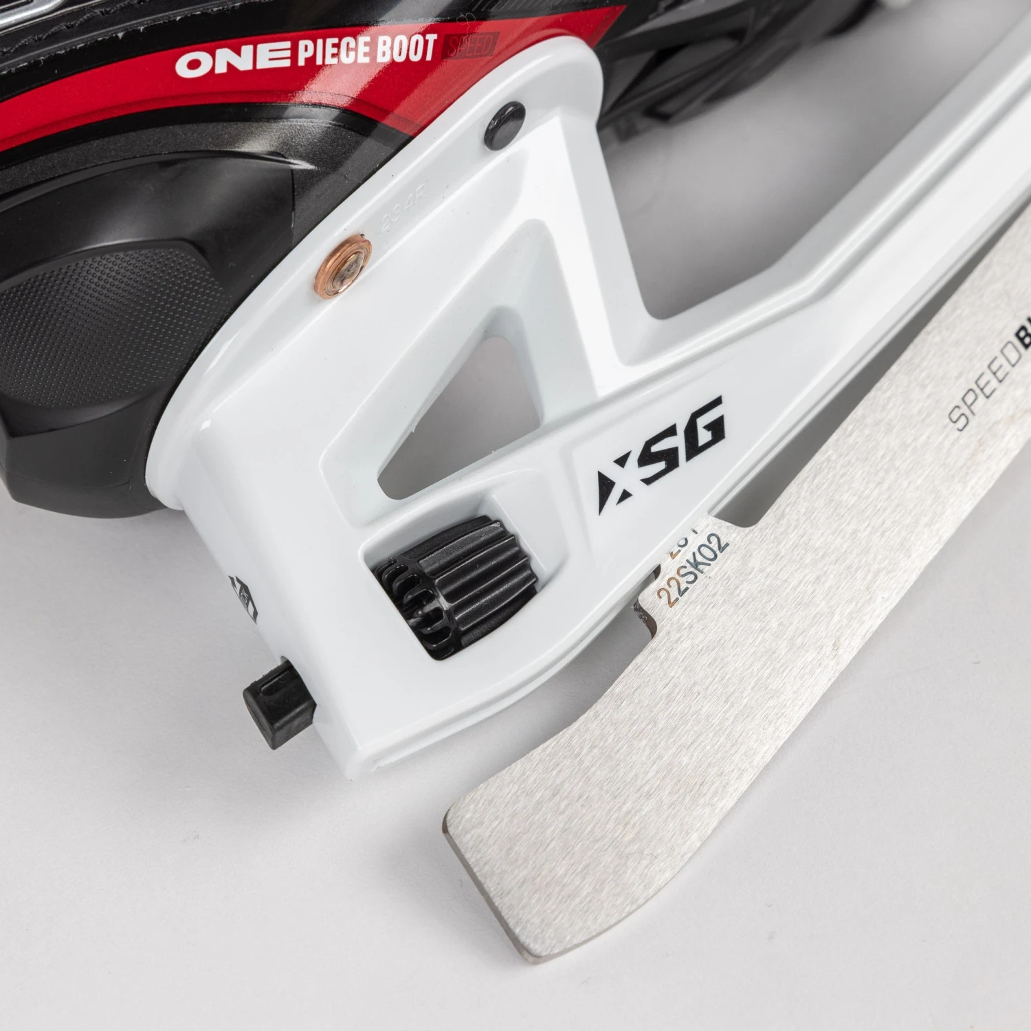 The skates use CCM’s quick-release Speedblade XSG holder with a bladelock system, coupled with Speedblade XSG 10F27. This runner offers a durable edge that sustains performance over time, and its innovative 10F27 profile additionally promotes a forward-leaning goalie stance.