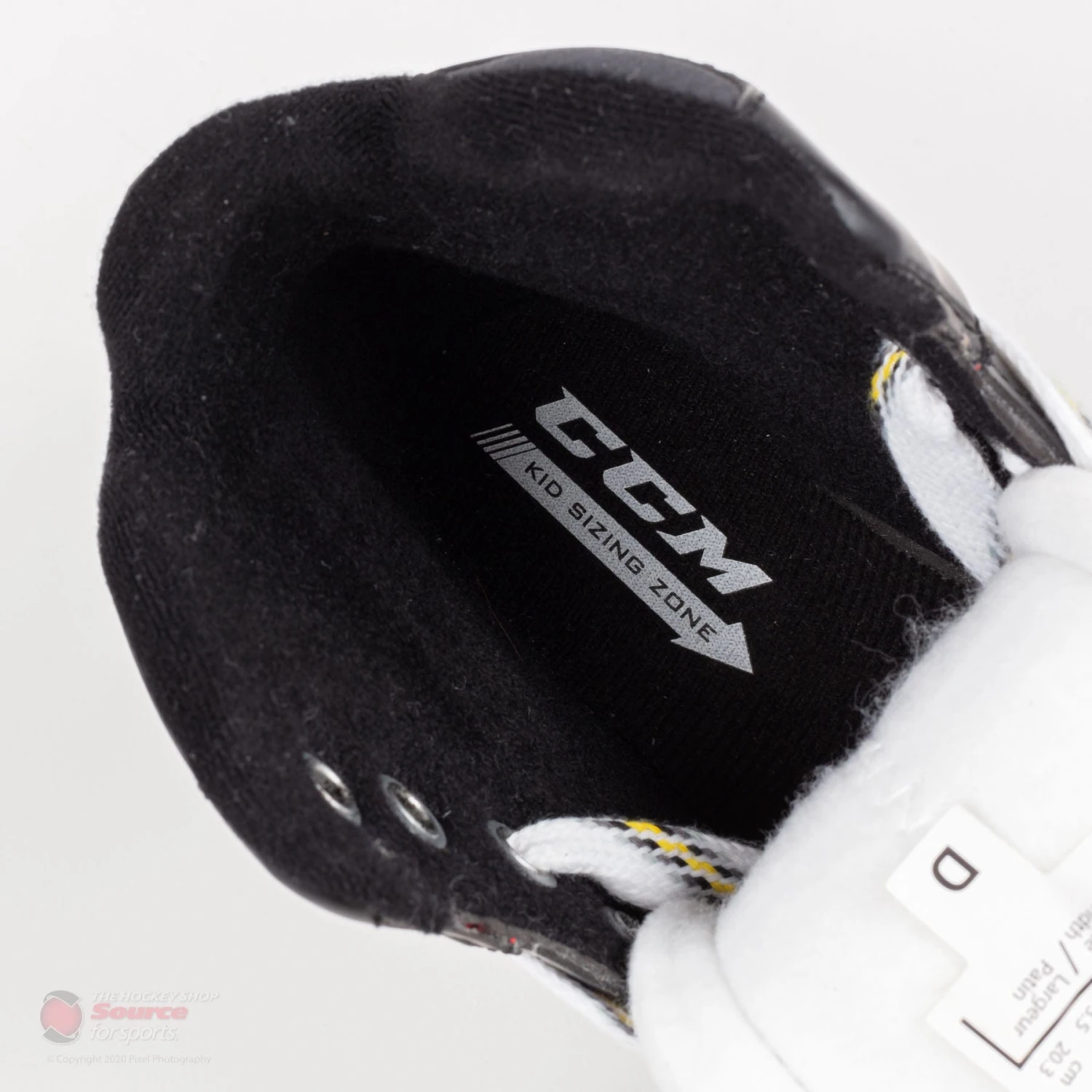 The CCM Super Tacks 9370 Goalie Skates feature a glossy composite quarter with white CCM branding as well as yellow, grey, black and white accent stripes giving the skate a sharp look setting them apart from the rest.