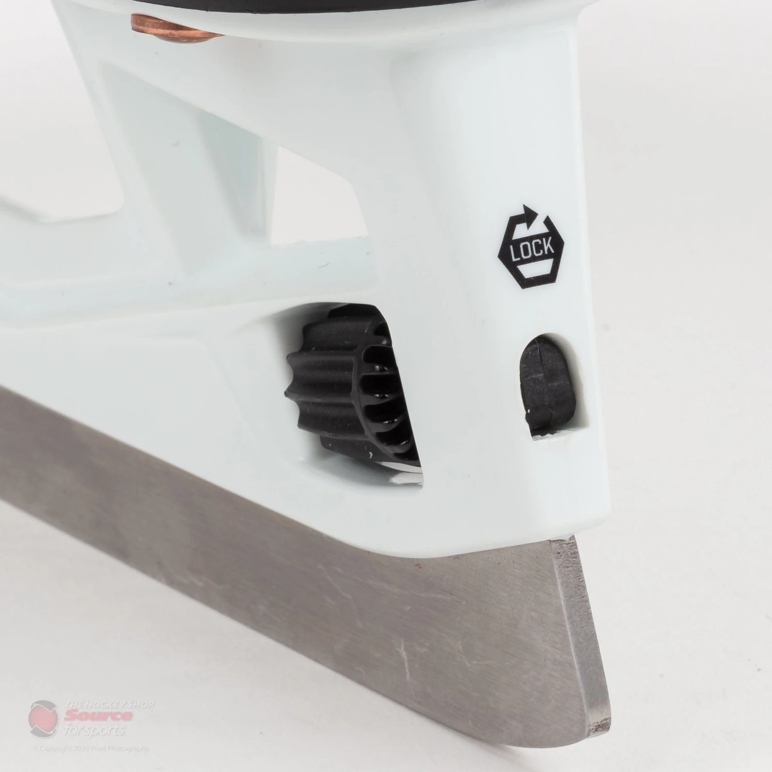 The holder on the CCM 9370 Goal Skates is the CCM Speedblade XSG holder featuring a new quick release dial blade lock system allowing goalies easy switching of blades whether its before a game or in between periods.