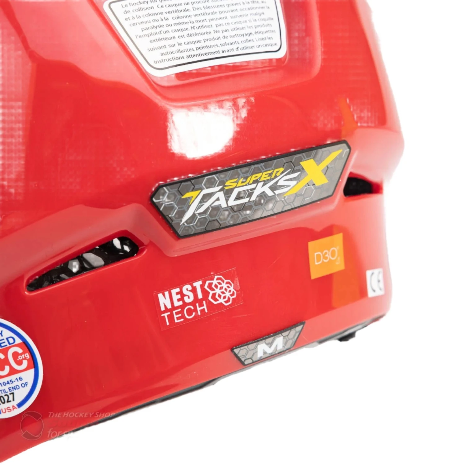 The CCM Super Tacks X Hockey Helmet comes in sizes Small through Large, and is available in Black, White, Navy, Royal, and Red.