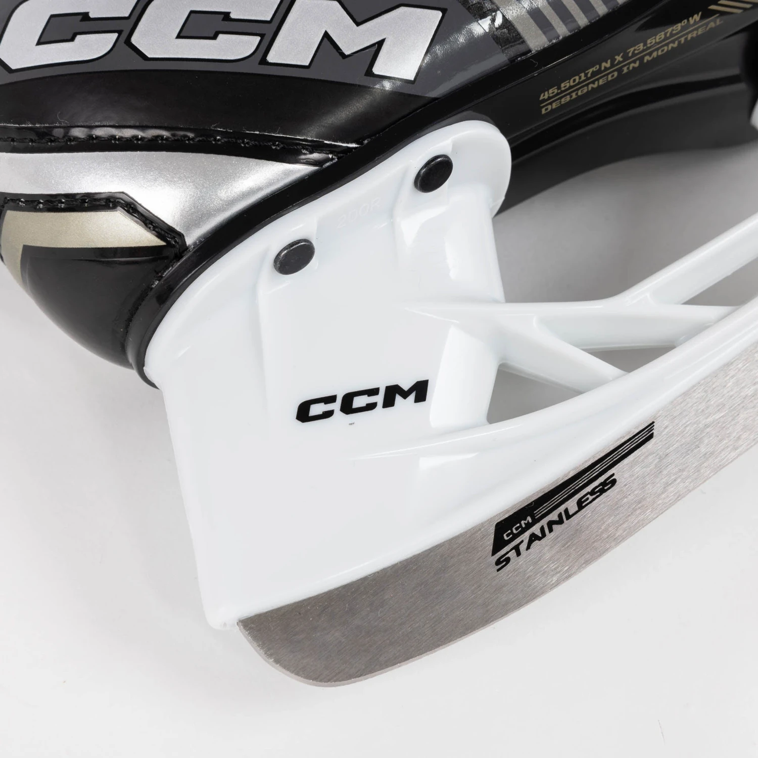 The skate uses a CCM Speedblade, which includes a non-replaceable steel blade. This particular holder is elevated for a better attack angle for developing players when skating.