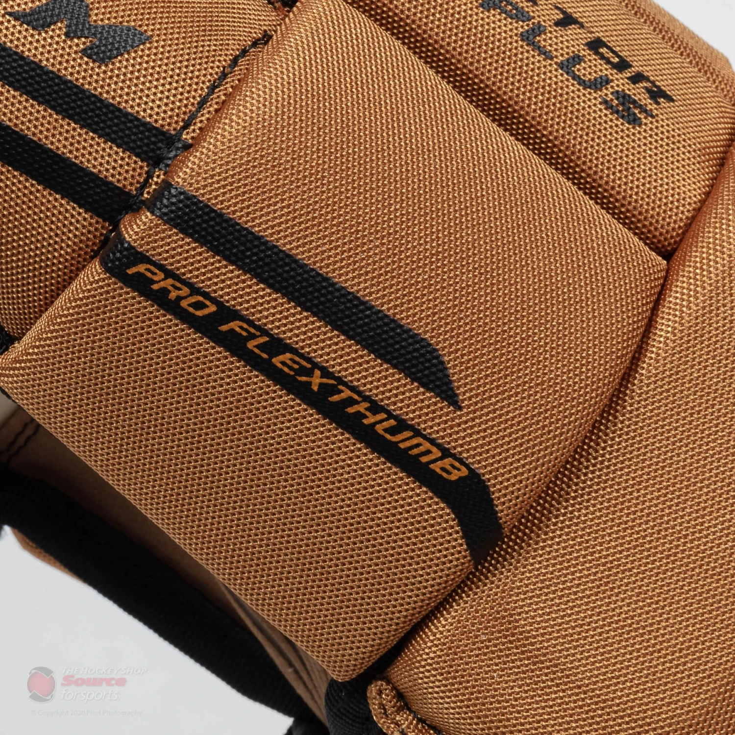CCM Vector Plus Gloves are fitted with a two-piece pro flex thumb, also seen on the 4R Pro2 Glove. The two-piece thumb allows for better movement and grip on your stick.